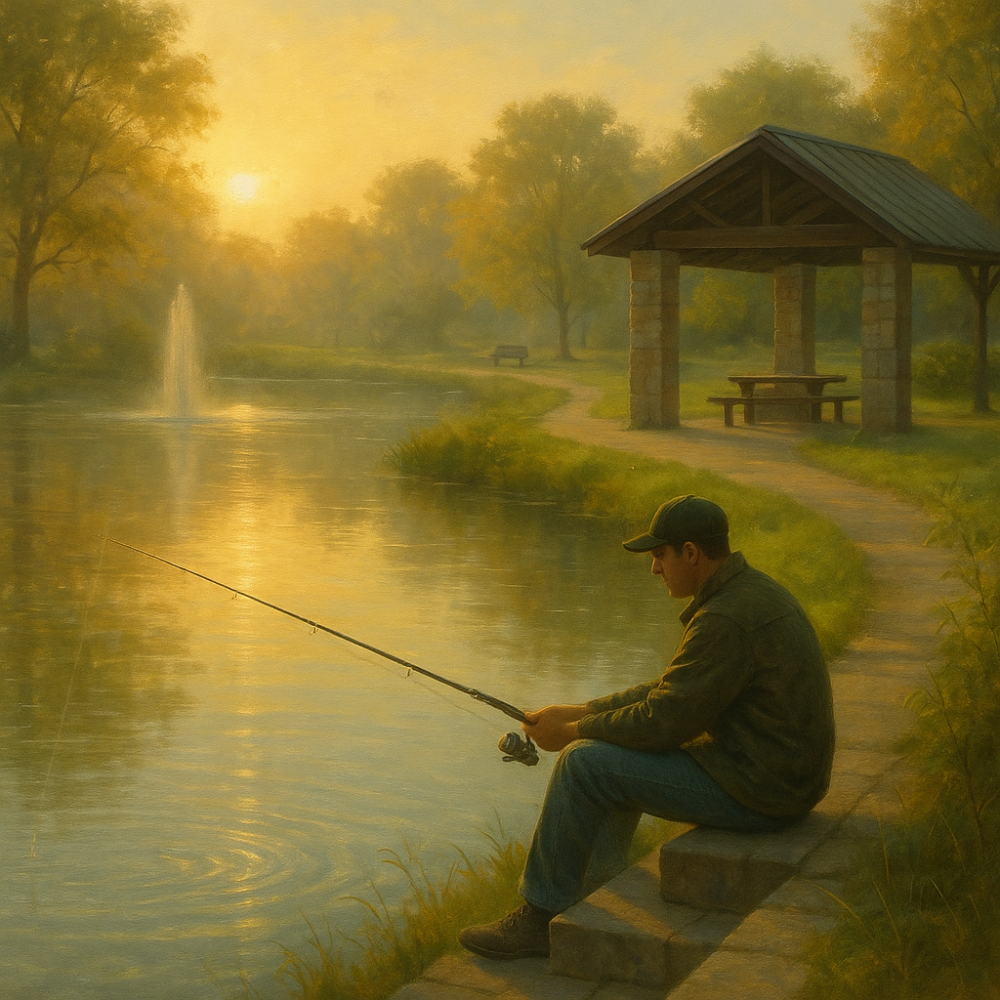 我和老公悠悠漫步至池边,远远便看见那位熟悉的垂钓人早已就位。他是一位白人青年,个子不高,身材结实,总是戴着棒球帽,穿一件朴素的夹克。衣着简洁,却与清晨的宁静氛围格[