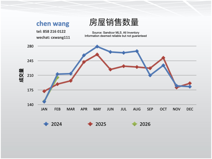 2026年1月份圣地亚哥市北部区域房价与12/25月份相比升高了10%,与去年同期相比也升高了3.3%。与4/24的峰值相比,1/26房价下跌了9.7%。10/25房价达到最低,与4/24的峰值相比下跌了27.3%。圣地亚哥县1/26房价比6/24的峰值下跌了5.6%。圣地亚哥县10/25房价也达到最低,与6/24的峰值相比下跌了8%。数据统计了圣地亚哥市北部(56高速走廊)地区民宅,包括独立房,连排房和康斗。共7个邮政[