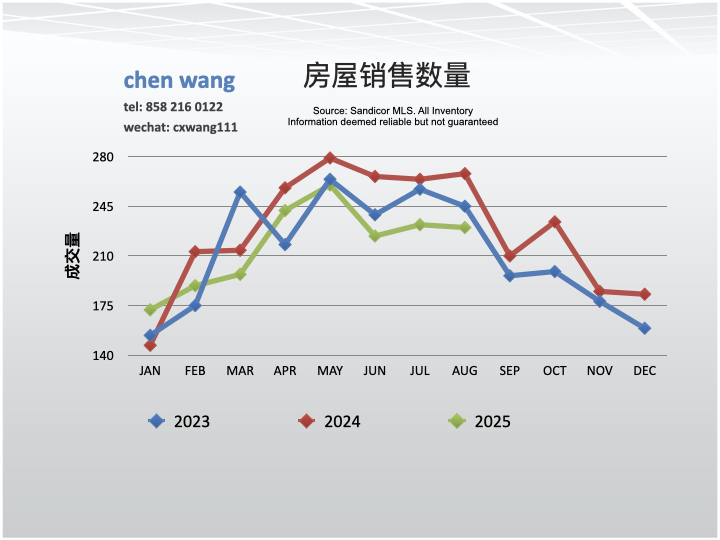 2025年12月份圣地亚哥市北部区域房价与11月份相比略有升高,然而与去年同期相比有所下降。虽然售数量略有升高,但库存量大幅下降说明上市数量的减少。从2023,2024和2025的价格曲线来看房价每年3-4月份开始升高,5-6份价格达到最高峰。数据统计了圣地亚哥市北部(56高速走廊)地区民宅,包括独立房,连排房和康斗。共7个邮政编码区域:92126-MiraMesa,92127-RanchoBernardoWest,92128-Ranc[