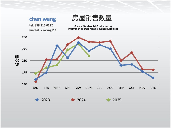 2025年6月份圣地亚哥市北部区域房价与上个月相比下跌6%,比去年同期下跌了6.7%。市场上的房屋数量今年以来持续增高,1月份:365套,2月份:420套,3月份:527套,4月份:631套,5月份:685套,6月份:739套。数据统计了圣地亚哥市北部(56高速走廊)地区民宅,包括独立房,连排房和康斗。共7个邮政编码区域:92126-MiraMesa,92127-RanchoBernardoWest,92128-RanchoBernardoEast,92129-RanchoPenasquitos,921[
