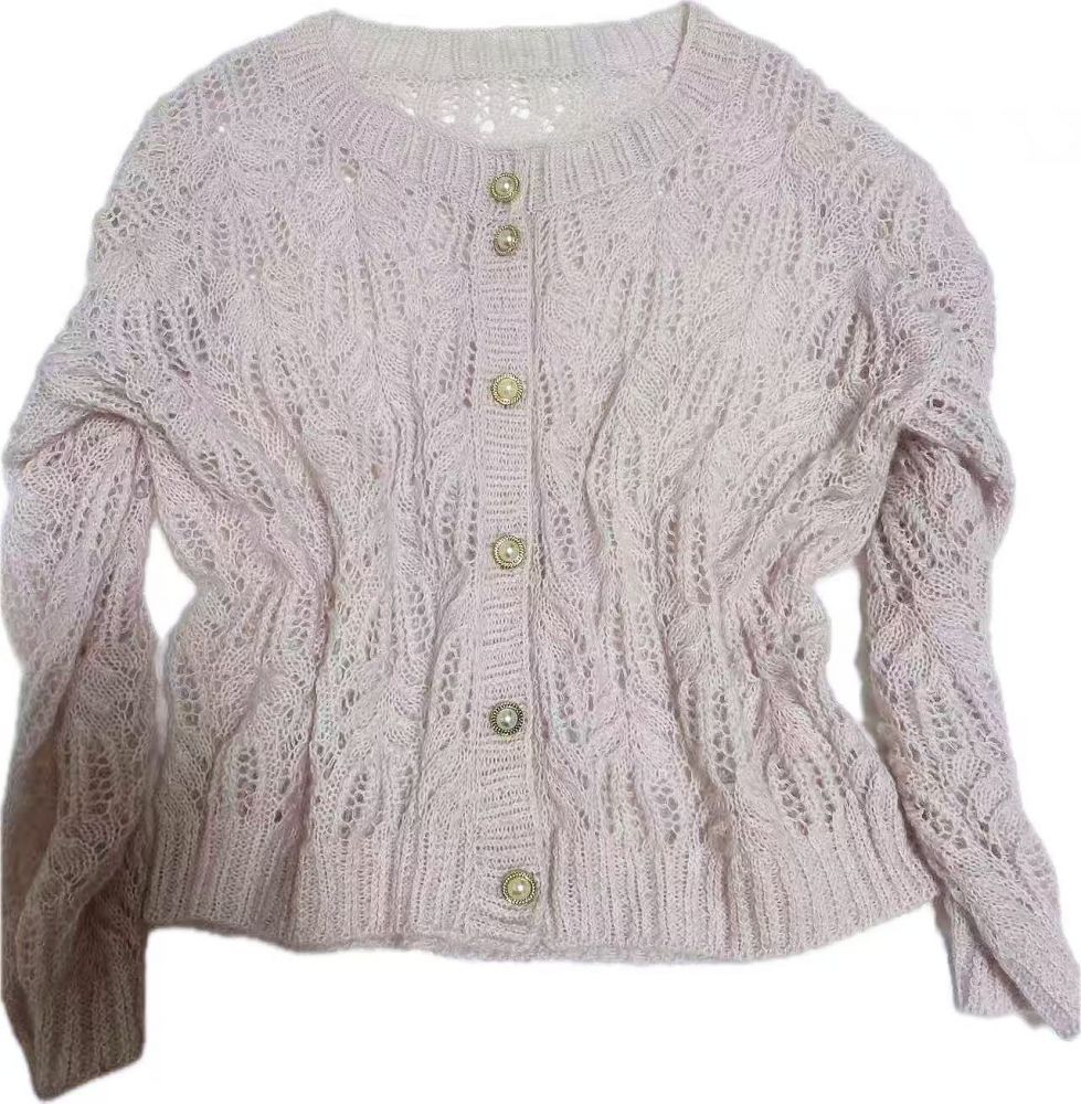 回国期间给好朋友的女儿织了这件棕榈花开衫本来想用两股康赛妮拉绒线织但觉得有点太飘就加了一股澳洲细羊毛出来的颜色也很漂亮是那种不张扬的灰粉色也有点分量感了很满意织完后还剩下不少线索性给自己来一件没想到这个颜色我穿也不错哈在国内某宝买的纽扣一个才一块钱很有时尚感的纽扣好看[