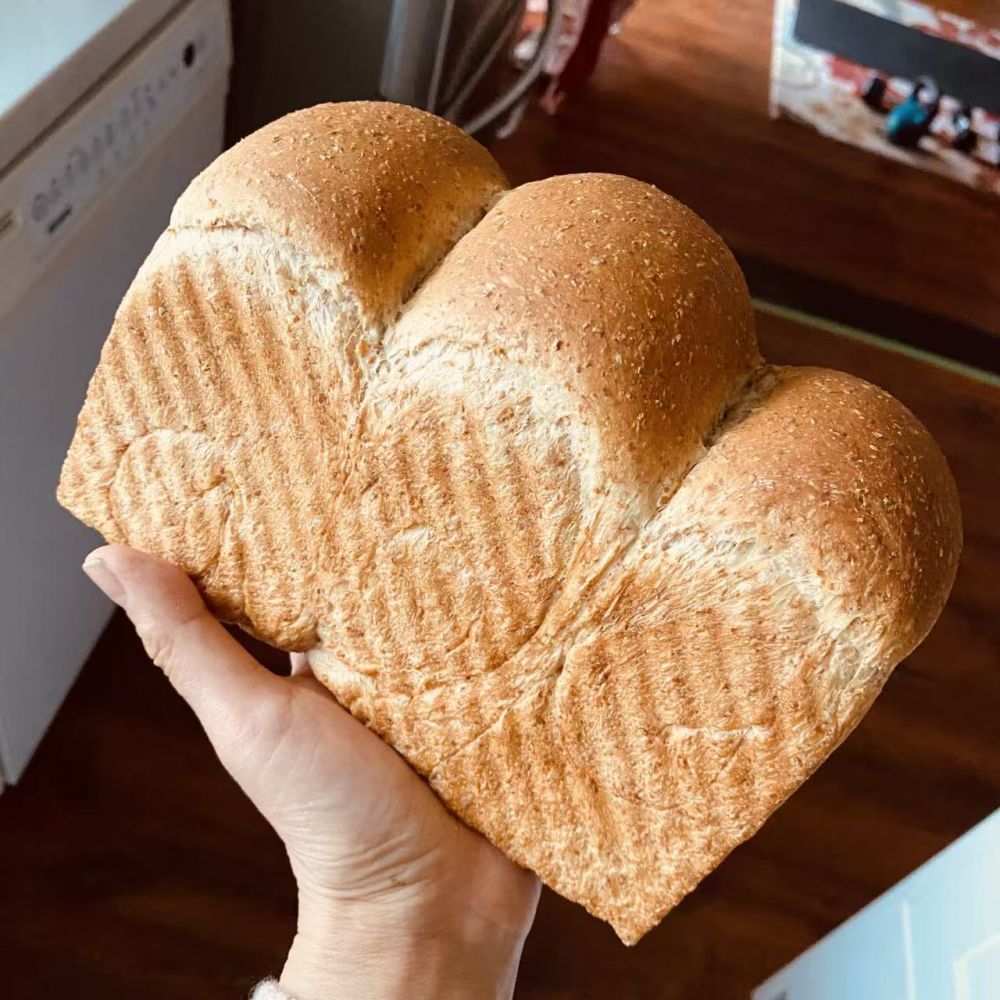 最近连续做了好多次全麦吐司口感很棒一点不剌嗓子内部组织也很细腻拉丝用的是Costco的unbleachedallpurposeflour和wholewheatflour(过一下粗筛把粗的麸皮留着做馒头用晒出来的带细麸皮的做土司)这几次都是60%这种过筛后的全麦等再加大全麦含量看看口感如何感觉80%就差不多了还是要兼顾口感放凉切稍厚的片冷冻晚上拿出来到室温早上小烤箱里烤几分钟外皮脆里面软再抹点自制黑芝[