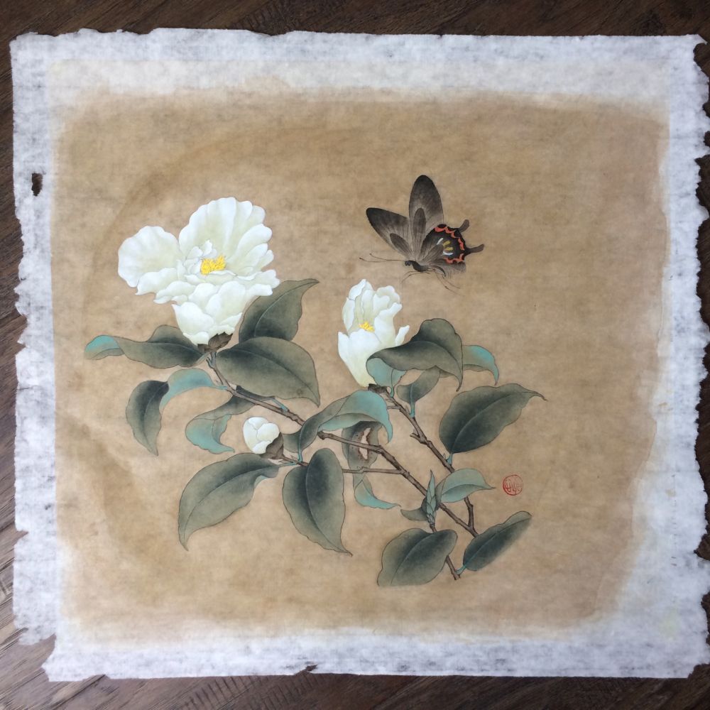这幅蝴蝶山茶花今天完成了。最欢喜的时刻是每一次小心翼翼把画从画板摘下来的时候。撕掉四周的胶条,薄如蝉翼的画纸会飘入手中。它轻的没有重量,却托得住绚烂的色彩,托得住九画十八染的功夫。 这幅画和第一张一样,出了很多差池,最大的败笔是花瓣铅笔画重了,最后用墨勾醒一次仍遮不住铅笔的痕迹。这幅画最大的收获是继续练习了叶子的画法,对水线的预留[阅读全文]
