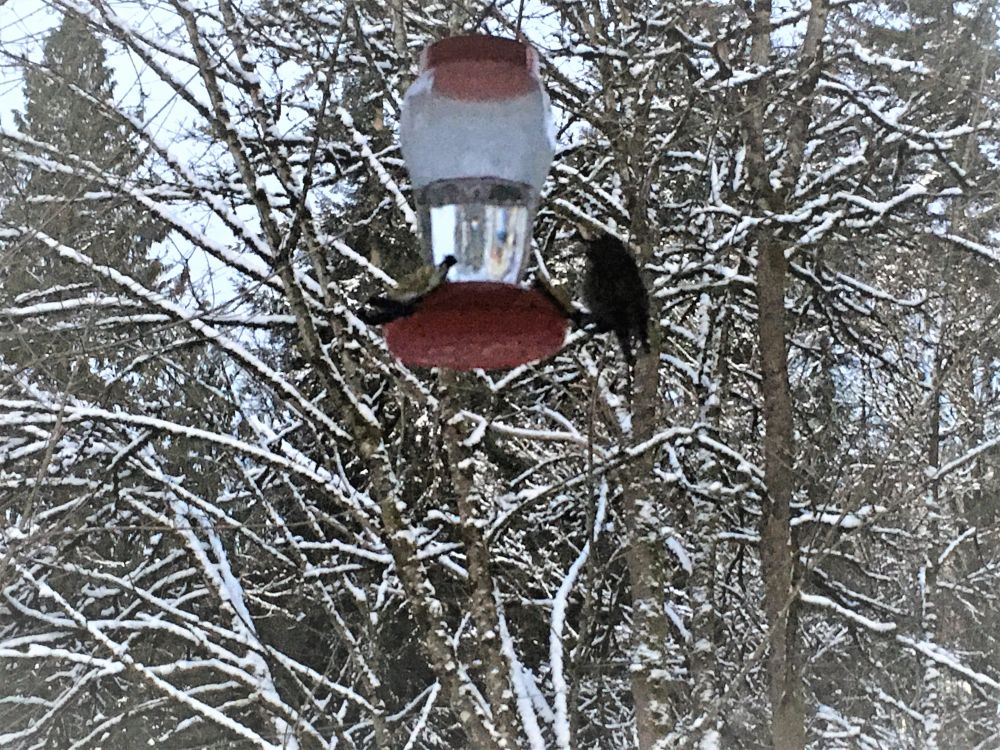 降温的早晨天气骤冷,气温到了零度以下。屋外的草坪和树林被一层薄薄的白霜覆盖着。虽然结束了夏时制,时间推后了一个小时,但十一月近七点的天空还是灰黑的。 我走进厨房,像平时一样,第一件要做的事儿就是看一眼窗外挂着的喂蜂鸟的糖水罐儿。不出所料,罐里的糖水已经结冰了。于是赶紧换上注了新鲜糖水的喂鸟罐儿。 过了一会儿,我惊喜地发现:喂鸟器上[阅读全文]