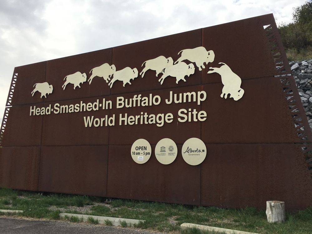 从waterton回卡城路上,在一片安静祥和,几十里都不见人烟的旷野看到一个博物馆-野牛碎头跳"Head-Smashed-inBaffaloJump",如果没有路牌指引没有人会注意到它的存在。走近路牌简介,发现它竟然是和古埃及金字塔和中国万里长城等齐名的世界文化遗产之一。