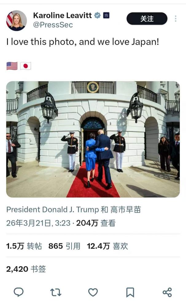 日相访美,白宫女发言人在X上配图发文「IlovethisphotoandweloveJapan!」,窜改亭林诗以誌。(2026.3.22)