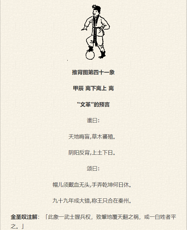 第四十一象:“天地晦盲、阴阳反背”是对毛时代罪恶的批判,“帽儿须戴血无头,手弄乾坤何时休。九十九年成大错,称王只[
