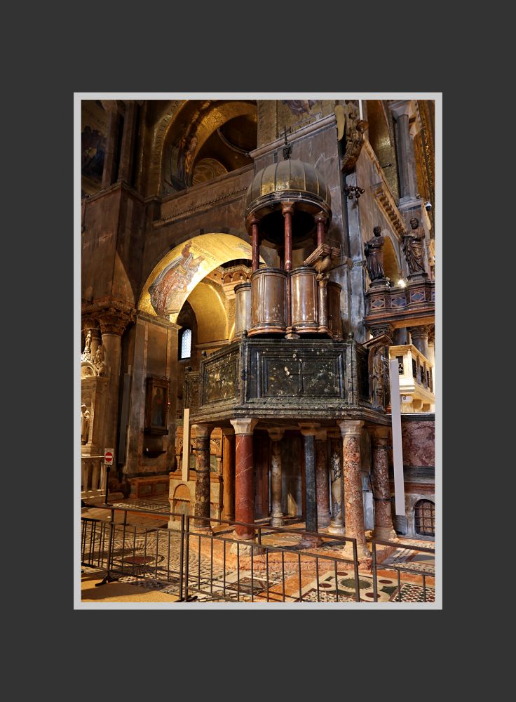 威尼斯的圣马可大教堂(下) 先说说上次那张照片的“谜底”。看官比我聪明,说出来的居然全对— 我拍照片时候不知道,是去查的。这东东叫Amboni,是个复数(单数:Ambone),圣马可大教堂内有左右一对,所以称为“双讲坛(ambonigemelli)”。它们是礼仪诵读台。它下部雕像或柱基支撑,显示拜占庭风格,与教堂金色马赛克背景形成呼应。 这两座讲坛[阅读全文]