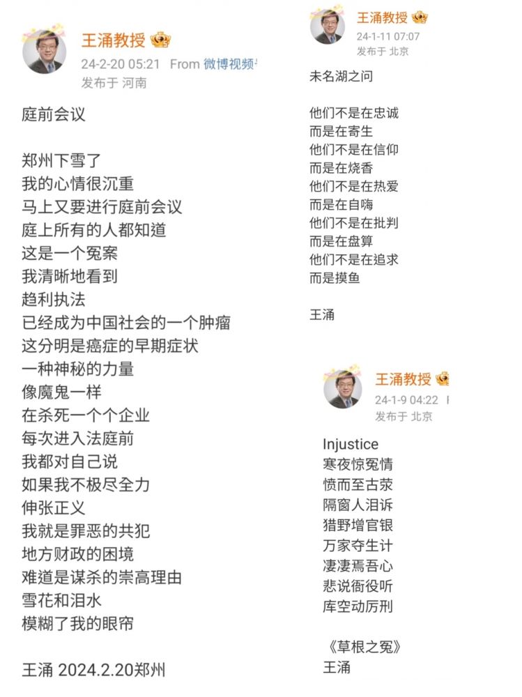 在微博上关注了一位中国政法大学法学院的教授:王涌老师。从博文看,王老师是一位酷爱写诗的文艺青(中)年。他写诗的主题多是春花秋月,夏荷冬雪,或是在各地旅行的感想。比如对春夜,他写道“残雪印车辙/空树满月色/山静不见人/偶有山禽飞“,对辞别夏天,他写道“夏退未名湖/秋笼燕京园/一雨隔夏秋/几时染青黄“,关于专业信息的分享反而不多。最[