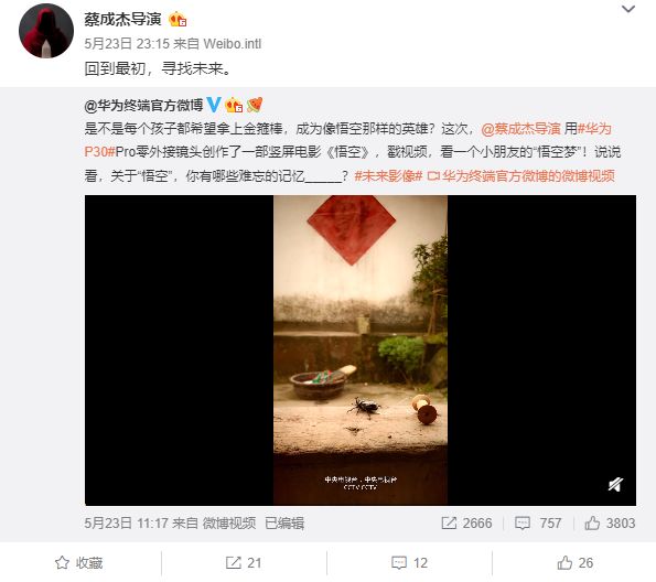 小In看到了导演蔡成杰在微博转发《悟空》时