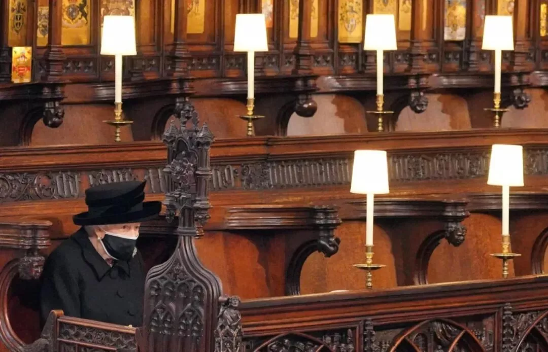 因为疫情的限制,菲利普的葬礼只允许30人参加。女王独自坐在圣乔治教堂里,和其他所有人隔开。那张她一个人坐在教堂长椅上的照片后来流传甚广。