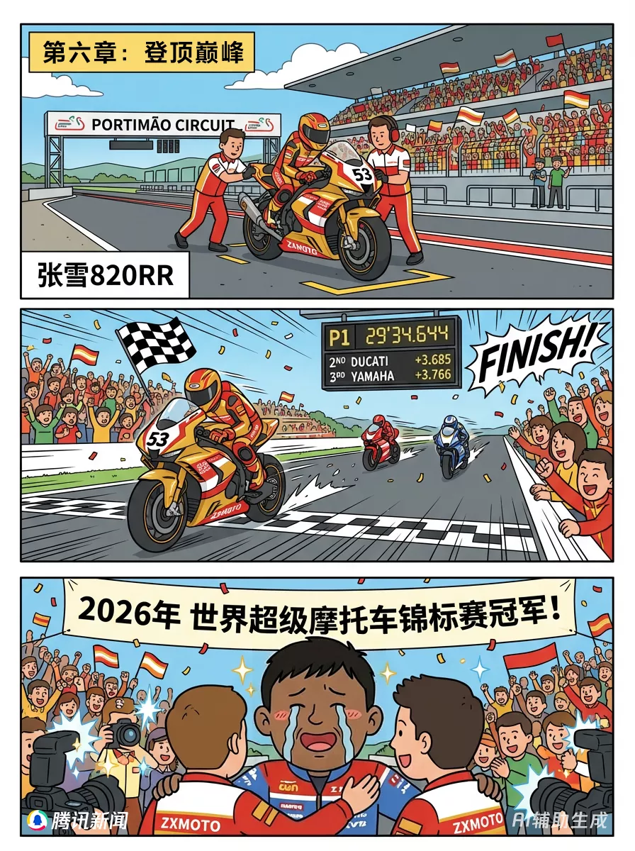 2026年3月28日,世界超级摩托车锦标赛(WSBK)葡萄牙站,张雪机车厂队车手驾驶820RR-RS赛车强势夺冠,以近4秒优势打破欧美日品牌长达数十年的垄断,写下中国摩托车制造商在顶级赛事的历史新篇章。