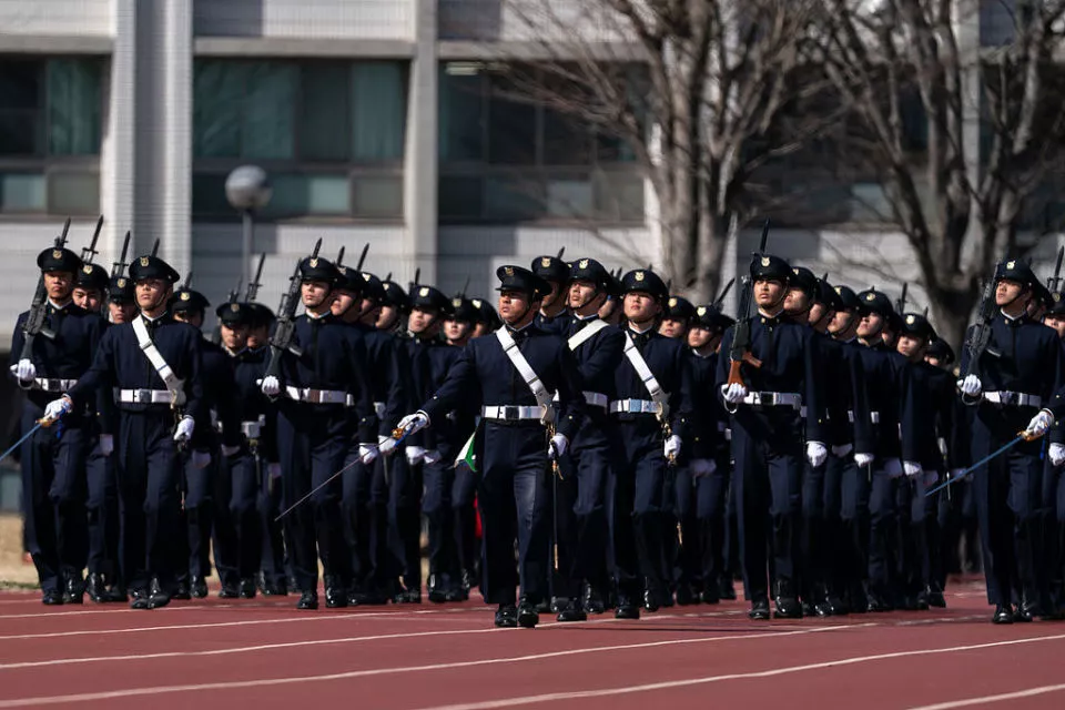 当地时间2026年3月14日,日本神奈川县横须贺市,日本防卫大学校举行毕业典礼后,学员们列队接受检阅。图/视觉中国