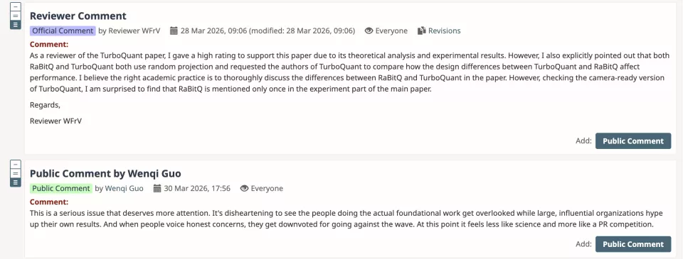 “然而我也明确指出,RaBitQ和TurboQuant都使用随机旋转,并要求TurboQuant的作者比较TurboQuant和RaBitQ之间的设计差异如何影响性能。”这位审稿人表示,正确的学术实践是在论文中深入讨论RaBitQ和TurboQuant之间的差异,但审稿时“惊讶地发现RaBitQ在主论文的实验部分只提到过一次”。