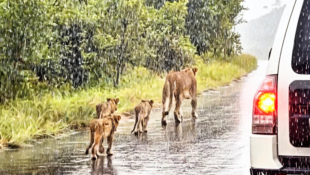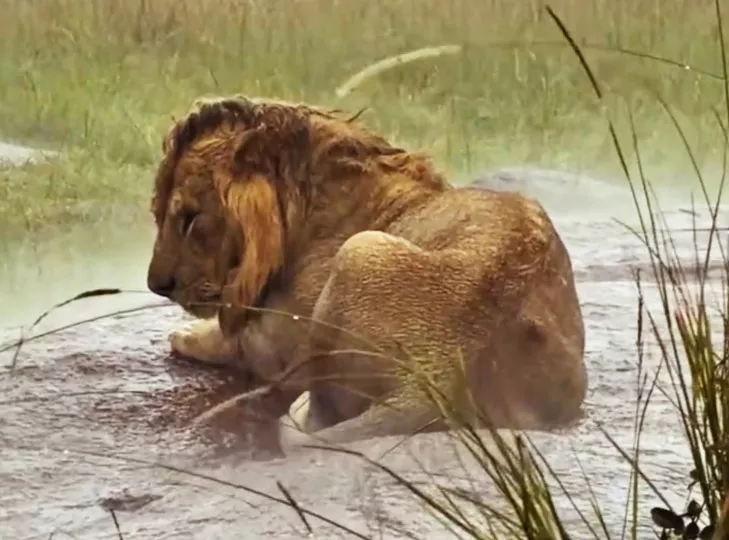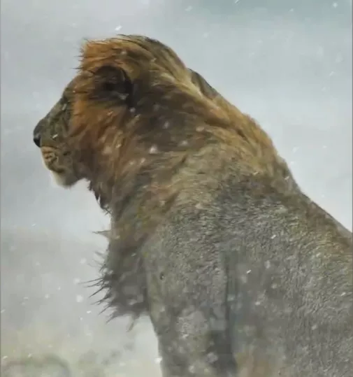 而狮子的被毛分为两层,外层粗硬的针毛表面覆盖着一层天然油脂,就像自带“防水外套”,雨水落在上面只会顺着毛发滑落,难以浸透。内层绒毛虽然有保暖作用,但成年雄狮身上并不厚重,加上狮子体型庞大、体脂与皮肤厚实,对短时暴雨和适宜气温的耐受度远高于小型动物。
