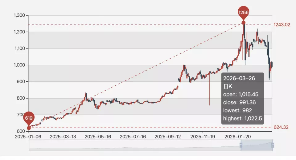 (2025年以来国内金价走势,2025年金价大涨58%,期间老铺黄金三次涨价。2026年金价一度涨26%,老铺于今年2月28日涨价后,金价于近日已抹去年内全部涨幅。)
