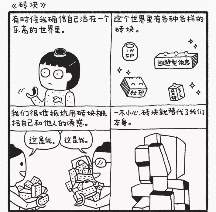 这或许就像杰尼丸子画的“乐高的世界”:当我们都在用各种贴上标签的“砖块”概括自己时,一不小心就让砖块替代了我们本身。