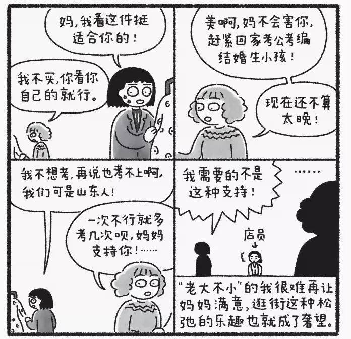 她还是要每天面对现实,不得不承认自己的弱小和失败,家族聚会时还是只能坐在小孩那桌。她曾希望转行,并且可能会先gap一年,这在父母听来约等于孩子疯了,说“我要去死”。她和父母为此发生过不计其数的争吵。