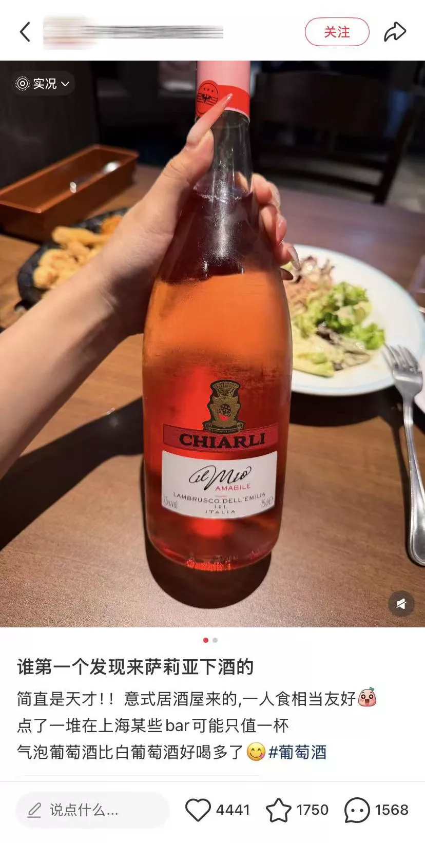 一批原本稳守奶茶店、精酿酒吧的年轻人也闻风而动。他们未必真馋酒,但会忍不住点一杯,试试咸淡。有广东地区的网友使用外卖服务,点一瓶萨莉亚的葡萄酒,叠加平台优惠券,到手价不过20块出头。餐酒从佐餐的附属品,变成人们单独购买,甚至囤货的潮流单品。