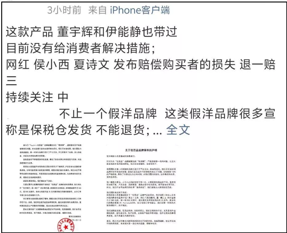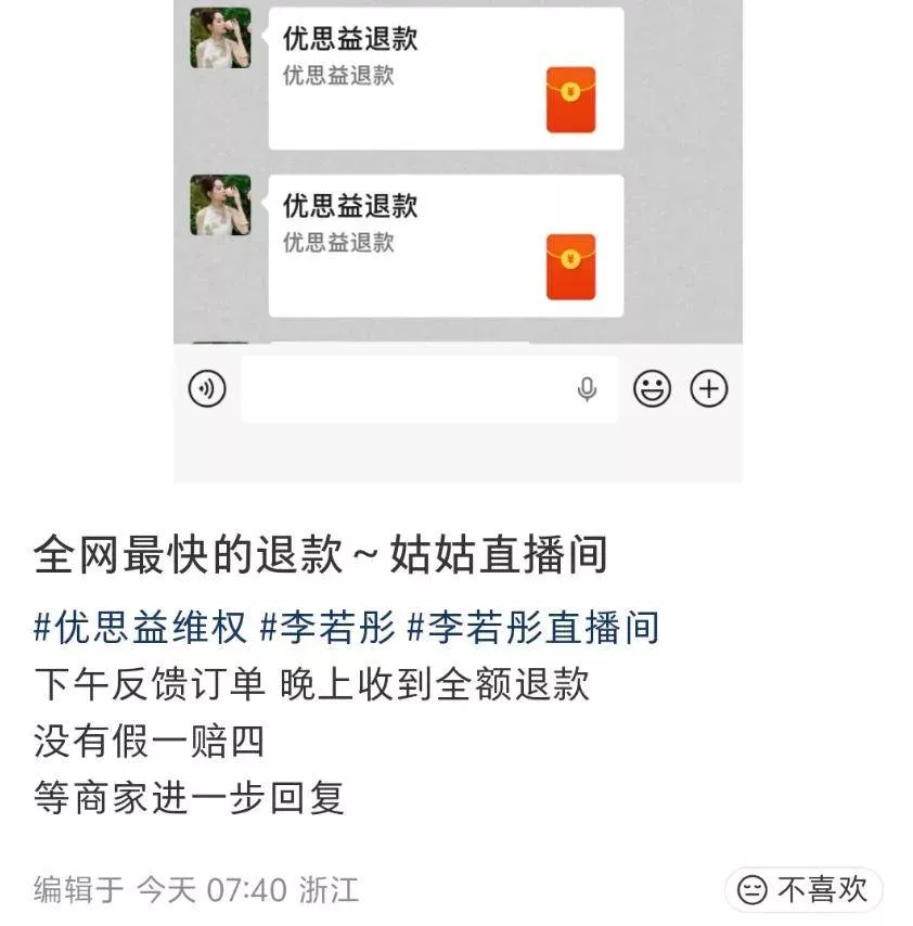 像李若彤就比较爽快,连夜给消费者退了款,只不过姑姑处理方式还是不及网红侯小西、夏诗文,二人是目前唯二主动承诺退一赔三的博主。