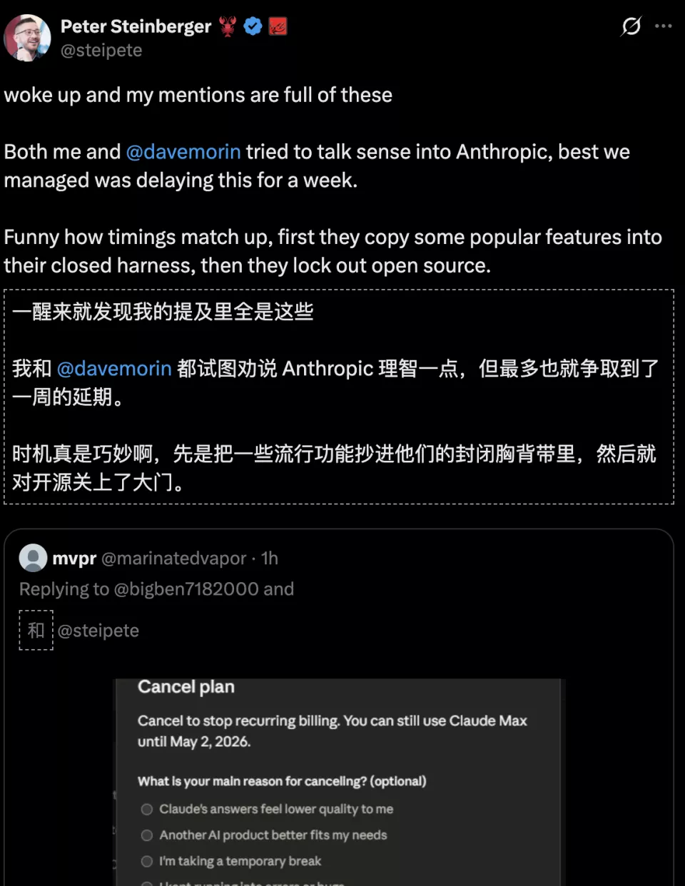 Peter本人也无奈发声,暗示Anthropic「关门打狗」,「白嫖」开源社区: