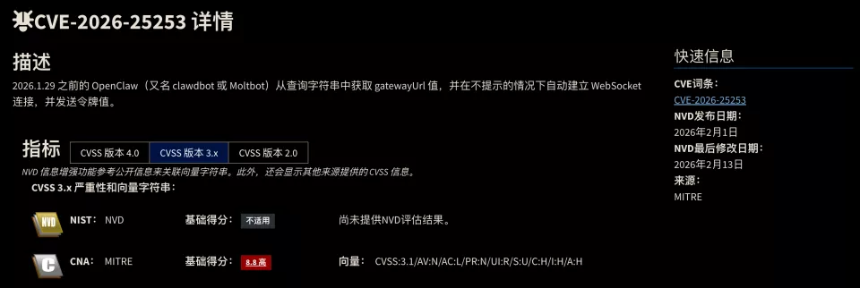 它被曝出一个CVSS 8.8分的高危漏洞(CVE-2026-25253),攻击者可以通过一条链接偷走用户的认证令牌。