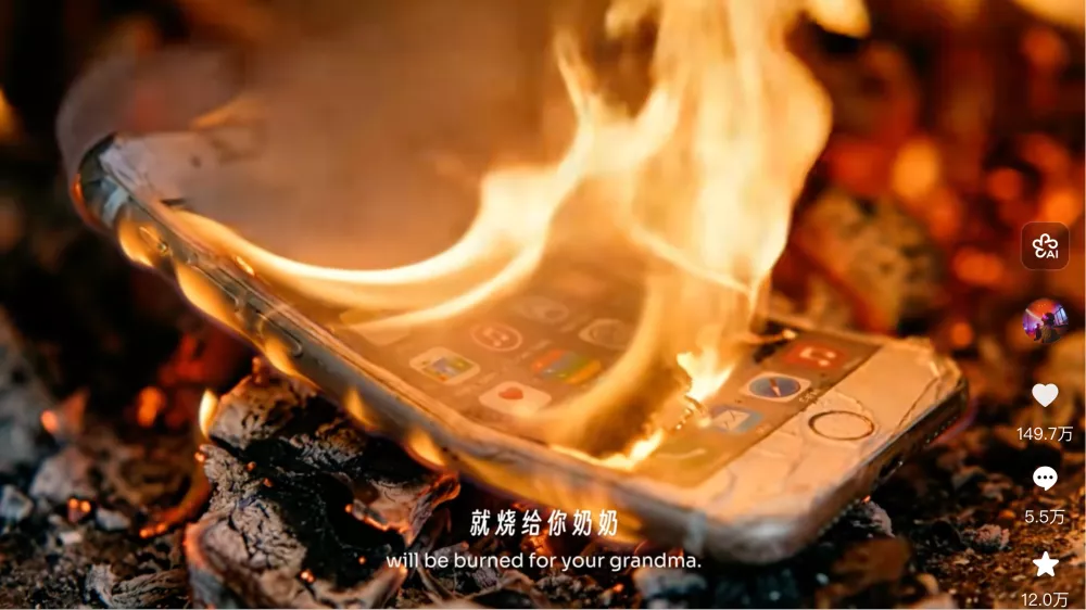 男孩把纸手机小心翼翼地放进火盆。火焰升起,纸张卷曲,烟慢慢向上飘去。他心里相信,那部手机会被送到那个“很远的地方”。