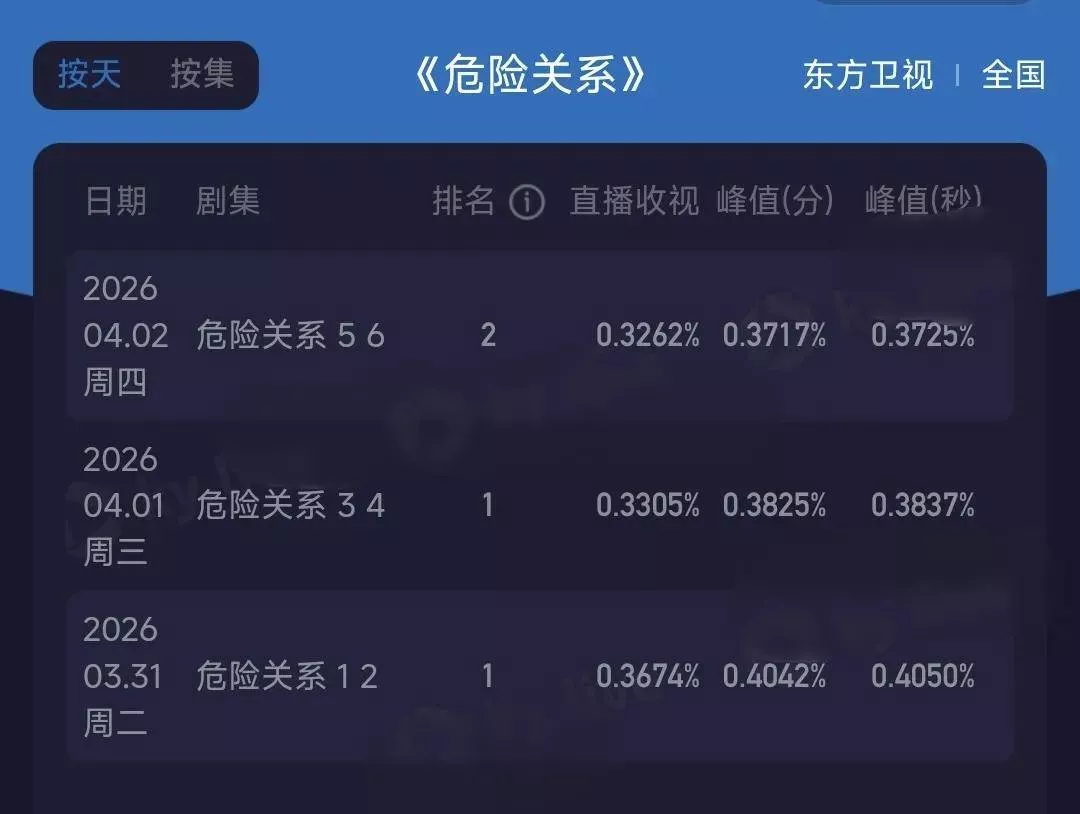 线下成绩方面,《危险关系》由东方、江苏和北京三大卫视上星播出。开播的时候收视率成绩还算不错,但是剧情却没能留住观众。三大卫视的收视率一天比一天低,该剧的收视成绩也是越来越差,实现了台网双扑街。