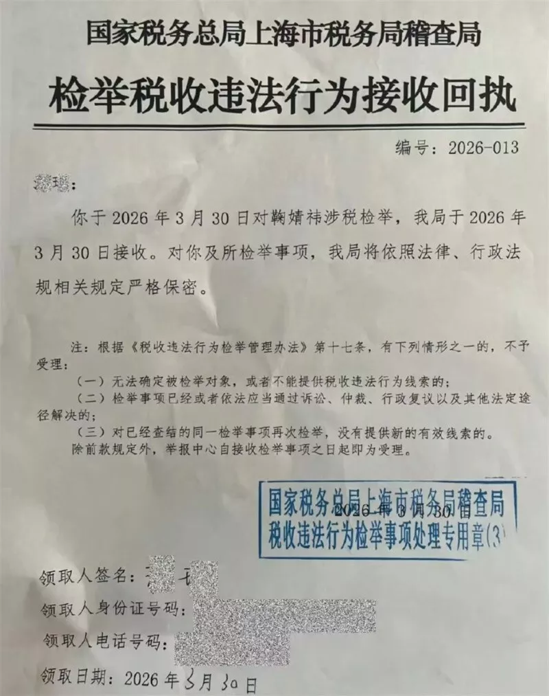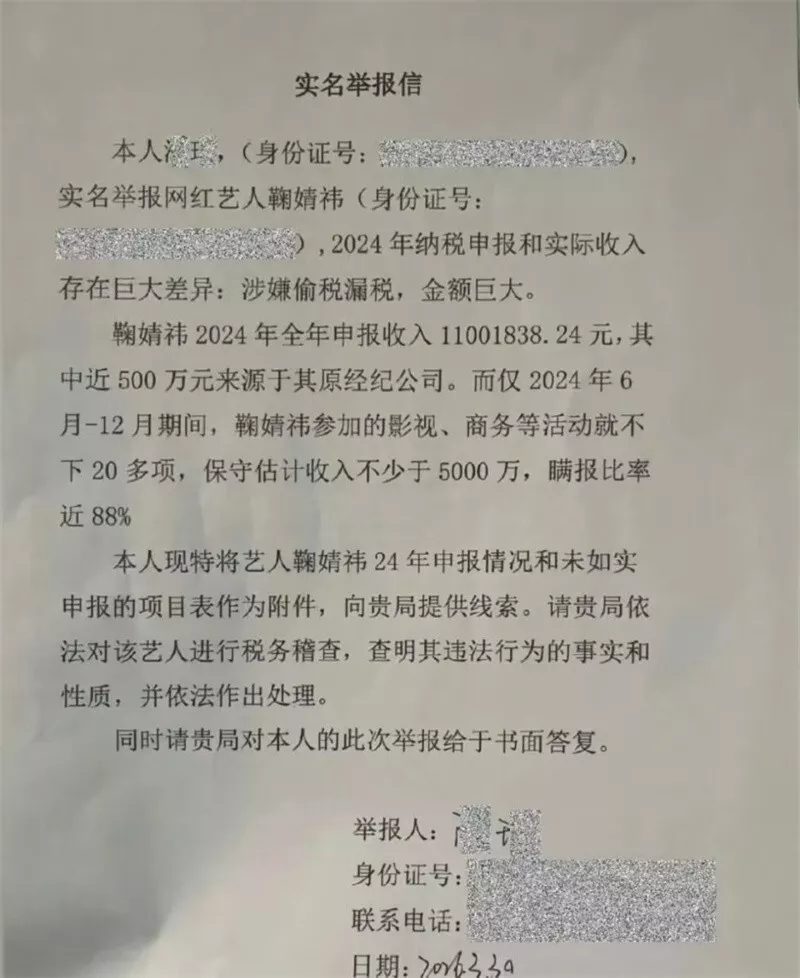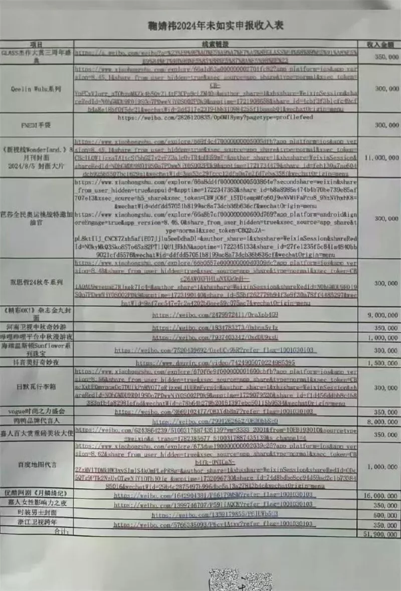 举报信称鞠婧祎2024年全年申报收入1100万余元,其中一半来自原经纪公司。但实际上,仅是当年6月至12月,鞠婧祎的收入就超过5000万,瞒报率超85%。