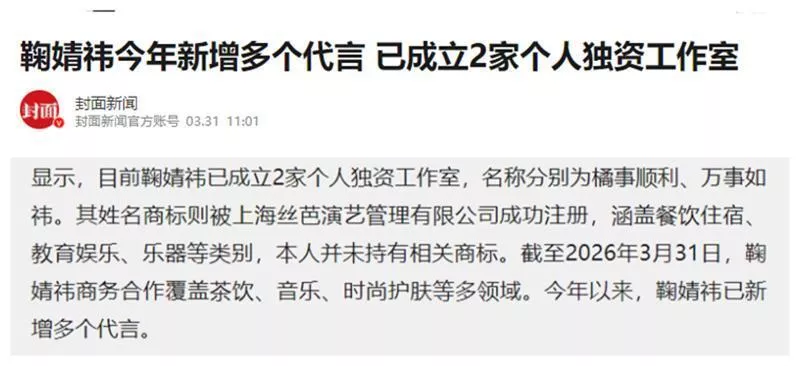 进入2026年至今,鞠婧祎又接连官宣诸多商务合作。其中包括知名购物平台的品牌大使、音乐平台超级会员代言人,以及某时尚眼镜品牌。