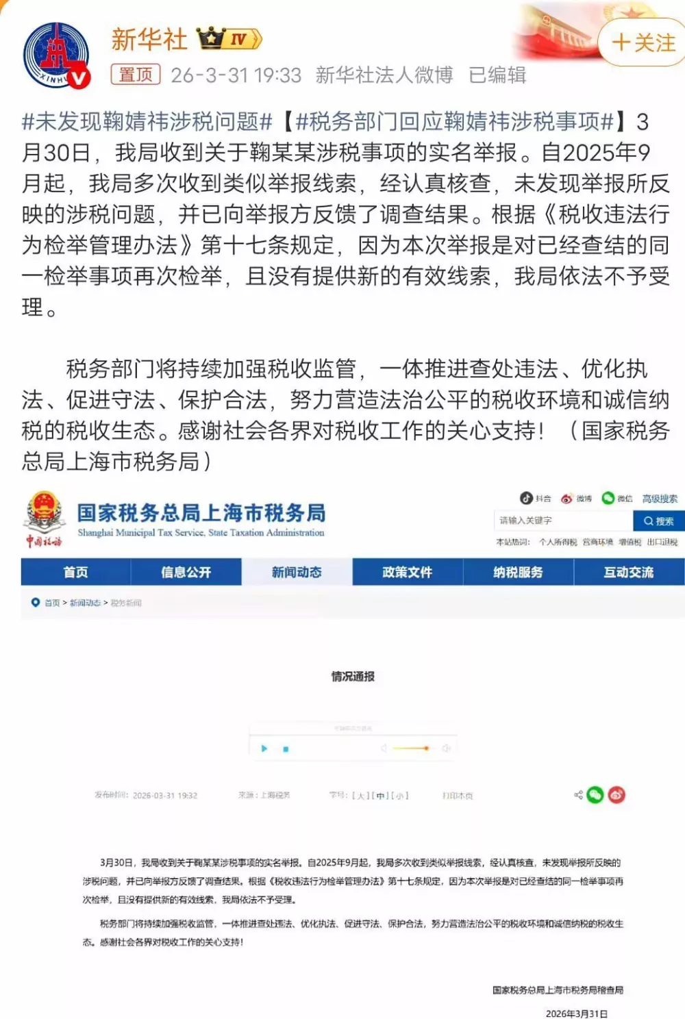 随后,税务部门发布通告,称“未发现鞠婧祎涉税问题”,还了鞠婧祎一个清白。