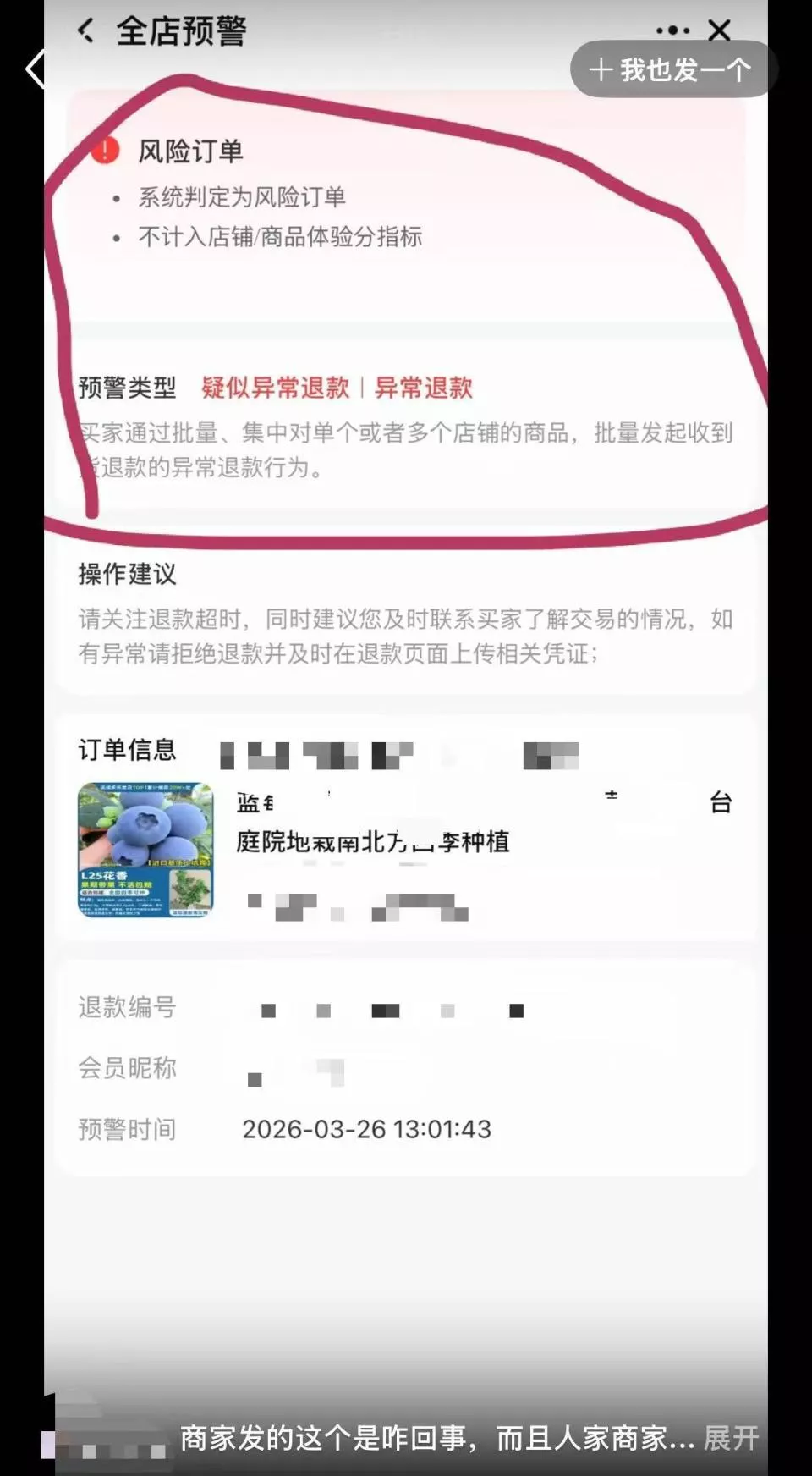 在雨姐的帖文评论区,有网友晒出当事商家发布的截图,显示该订单被标注为“风险订单,疑似异常退款”。随后,有网友质疑雨姐是否想“免费得苗”。