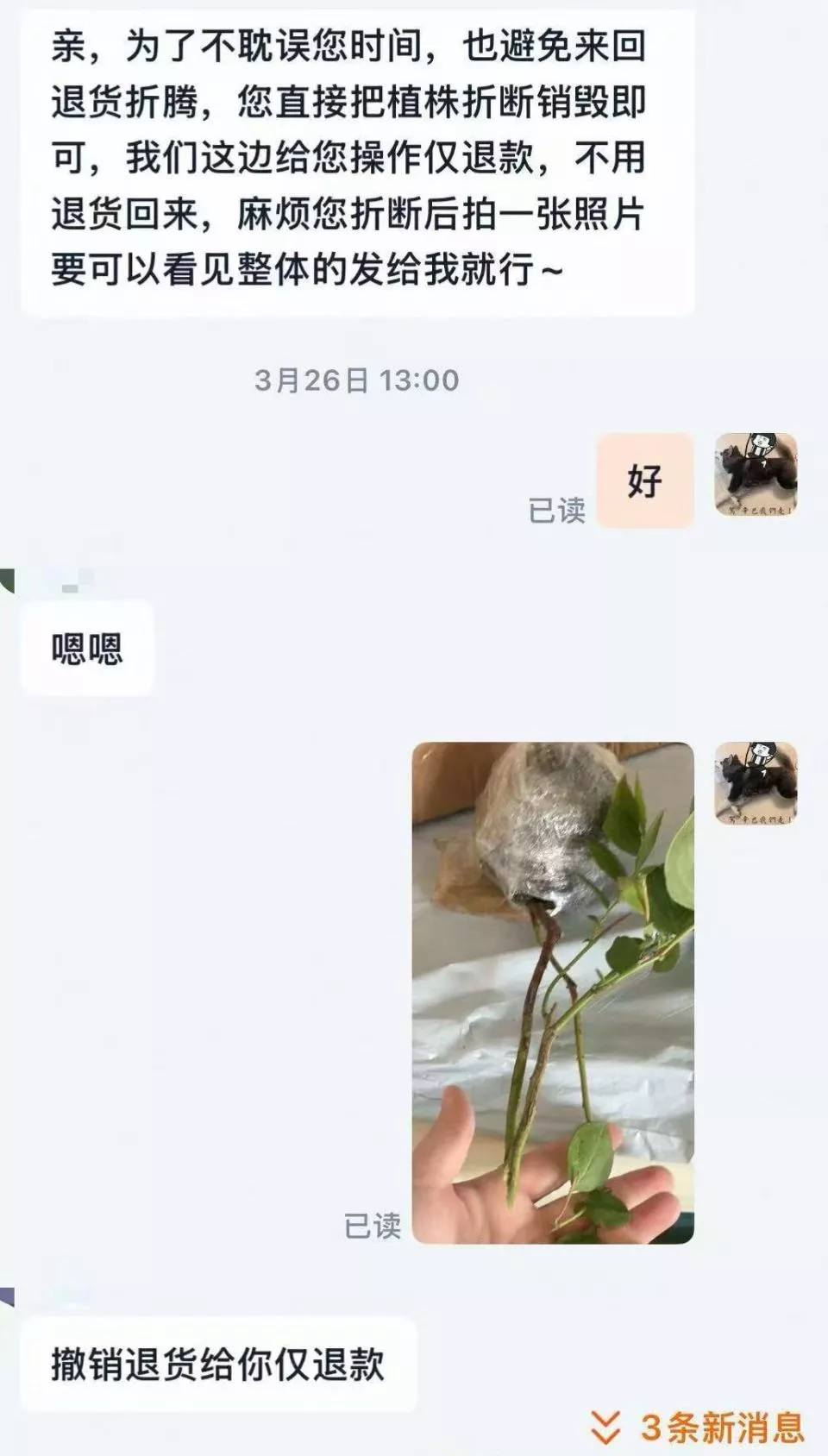 随后,商家发来信息:“为了不耽误您时间,也避免来回退货折腾,您直接把植株折断销毁即可,我们这边给您操作仅退款,不用退货回来,麻烦您折断后拍一张照片要可以看见整体的发给我就行。”然而,3月26日,雨姐按要求操作后,商家并未立即退款。“第一天没退,第二天再联系,对方一直已读不回。”她只得联系平台介入,28日商家才完成退款。
