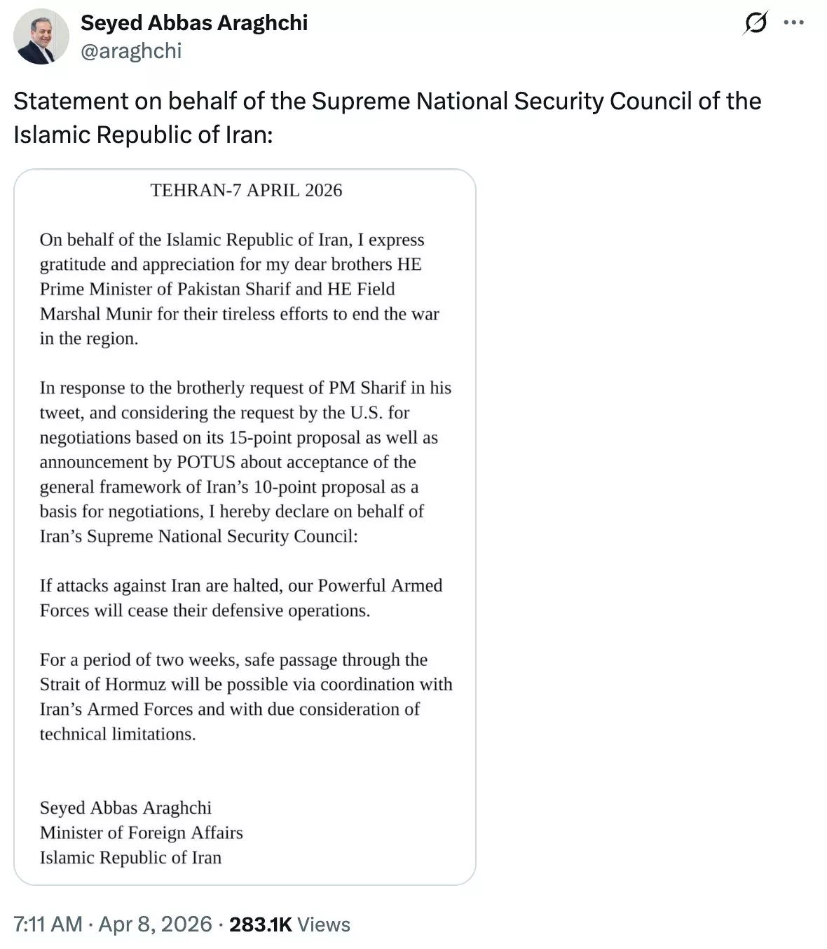 伊朗外长阿拉格齐(Abbas Araghchi)在川普宣布停火不足40分钟之后,代表伊朗伊斯兰共和国作出回应。(X截图)