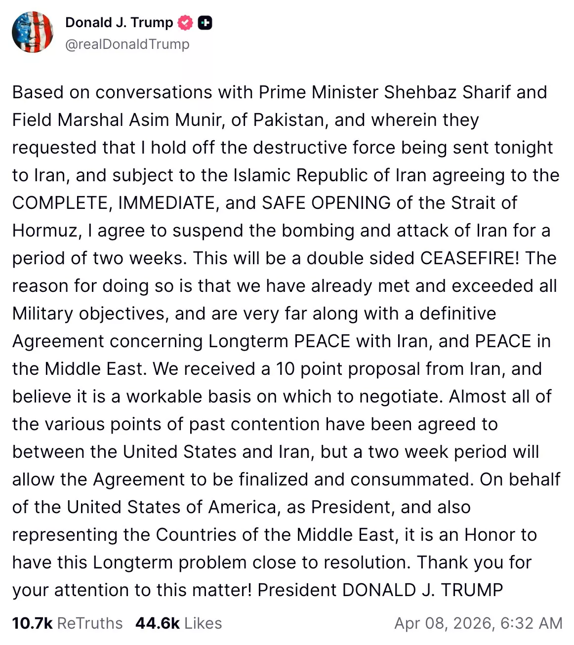 川普不只停止升级轰炸,还直接宣布了停火:“在伊朗伊斯兰共和国同意全面、立即且安全地开放霍尔木兹海峡的前提下,我同意暂停对伊朗的轰炸与攻击,为期两周。这将会是一场双方的停火!”