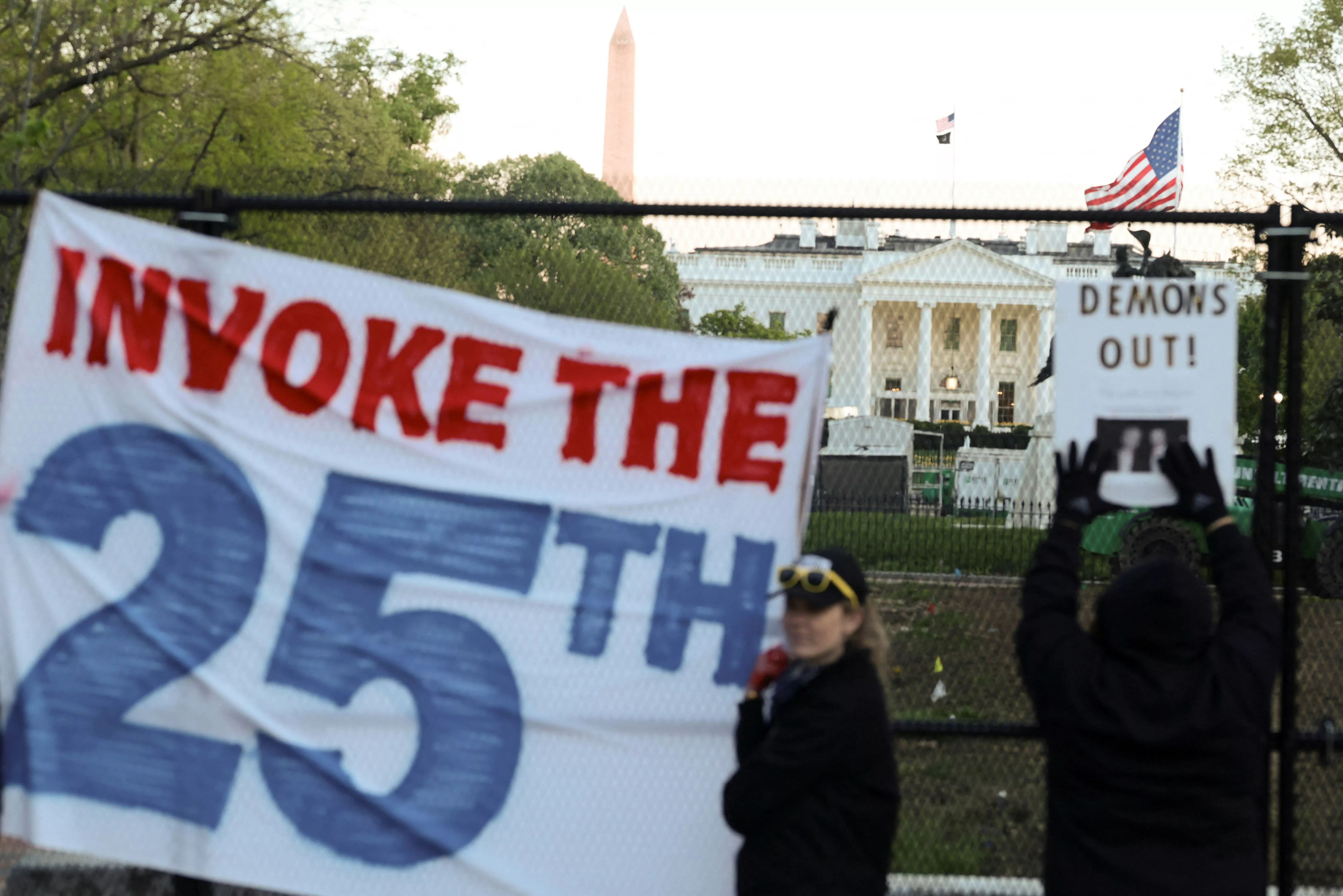 4月7日,白宫外有示威者要求内阁官员启动宪法第25修正案程序将川普免职。(Reuters)