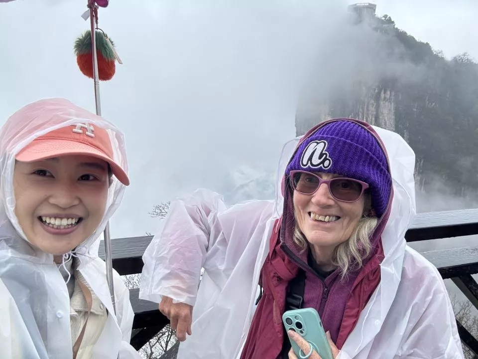 团队抵达张家界国家森林公园的那天,遇到大雾,峰林隐匿在浓雾后完全看不见,团友们选择在咖啡店休息。Gill表示想自己去观景台看看。趁着大家休息的间隙,吕燕便单独带Gill前往观景台。她陪着Gill耐心等待云雾散去,等了约半个小时,终于等到了峰林若隐若现。“她说虽然只有一点点,但也很满足。”随后,吕燕陪着Gill去找同伴。