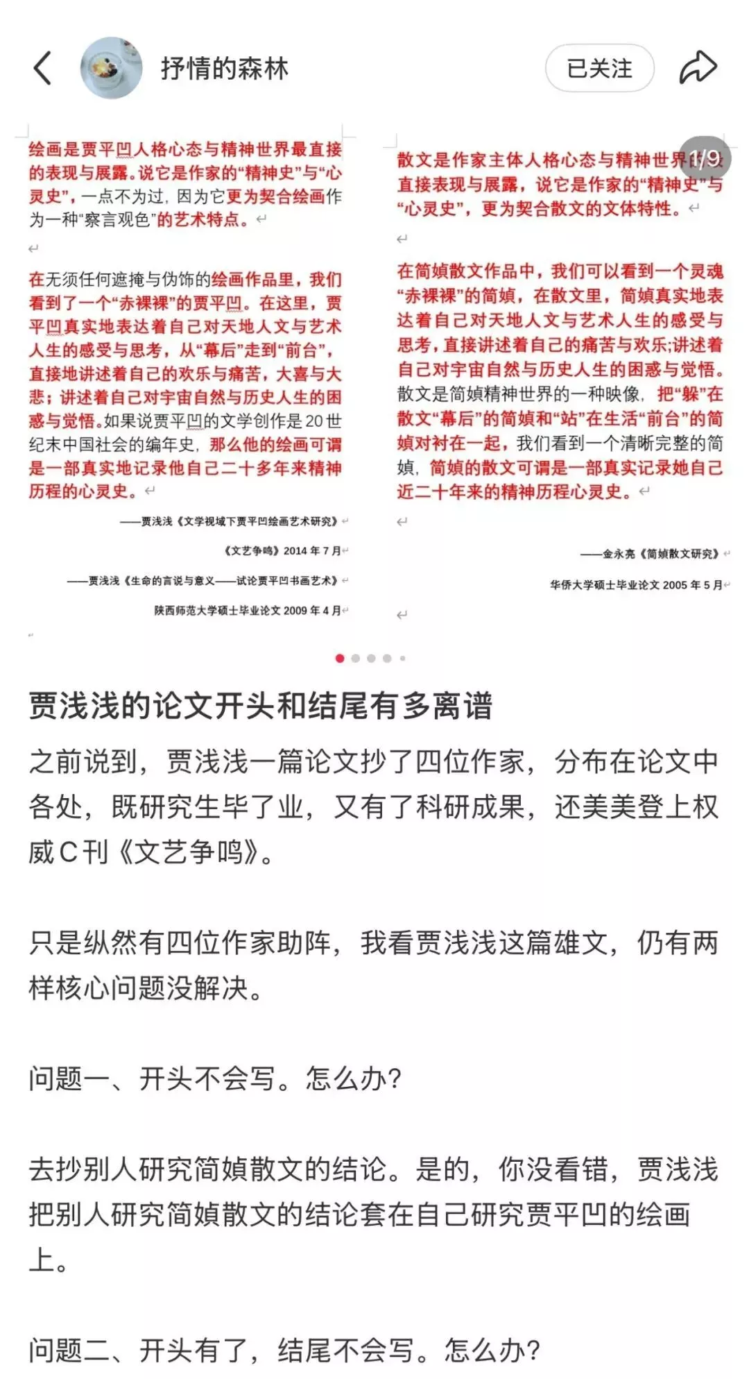 贾浅浅涉抄袭一事,最早由在文坛查重打假闻名的博主“抒情的森林”在3月底发帖,称贾浅浅2014年7月发表于《文艺争鸣》的学术论文《文学视阈下贾平凹绘画艺术研究》,涉抄袭4名不同作者已发表的文章,甚至包括贾平凹的旧文。 另一篇研究贾平凹书法创作的论文,个别语句也有直接搬运之嫌。 除抄袭疑云,论文也错字连篇,例如将历史典故“米芾拜石”误写为“米蒂拜石”。