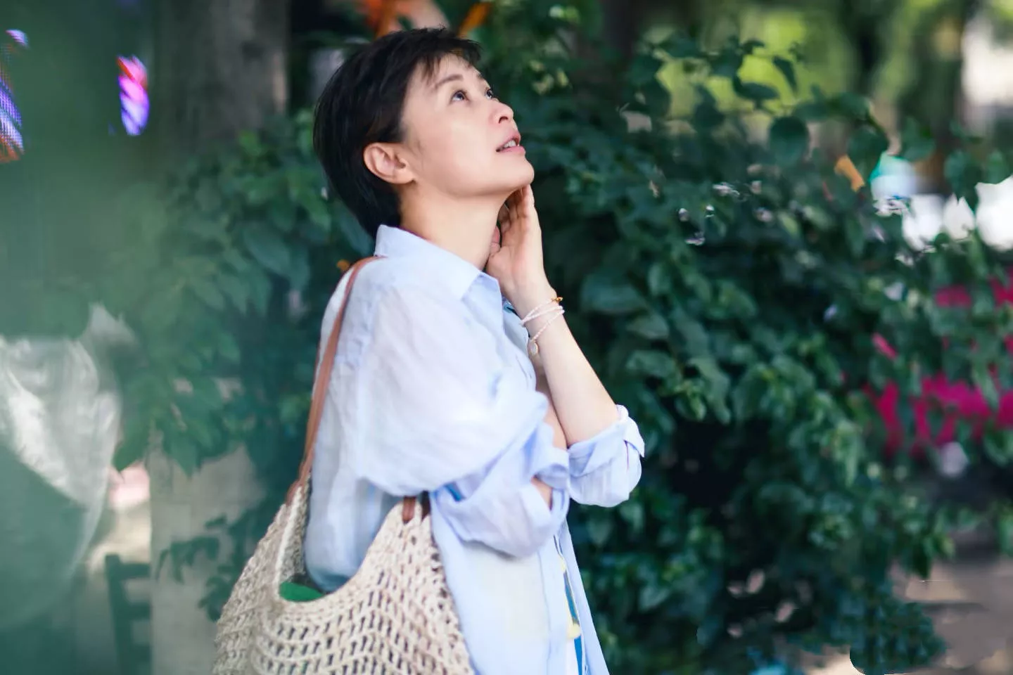 在她脸上,没有岁月的苍老和无力,只有那种经历岁月沉淀后的从容和淡然。阳光透过树叶洒在她身上,为画面晕染出一层温柔的滤镜。