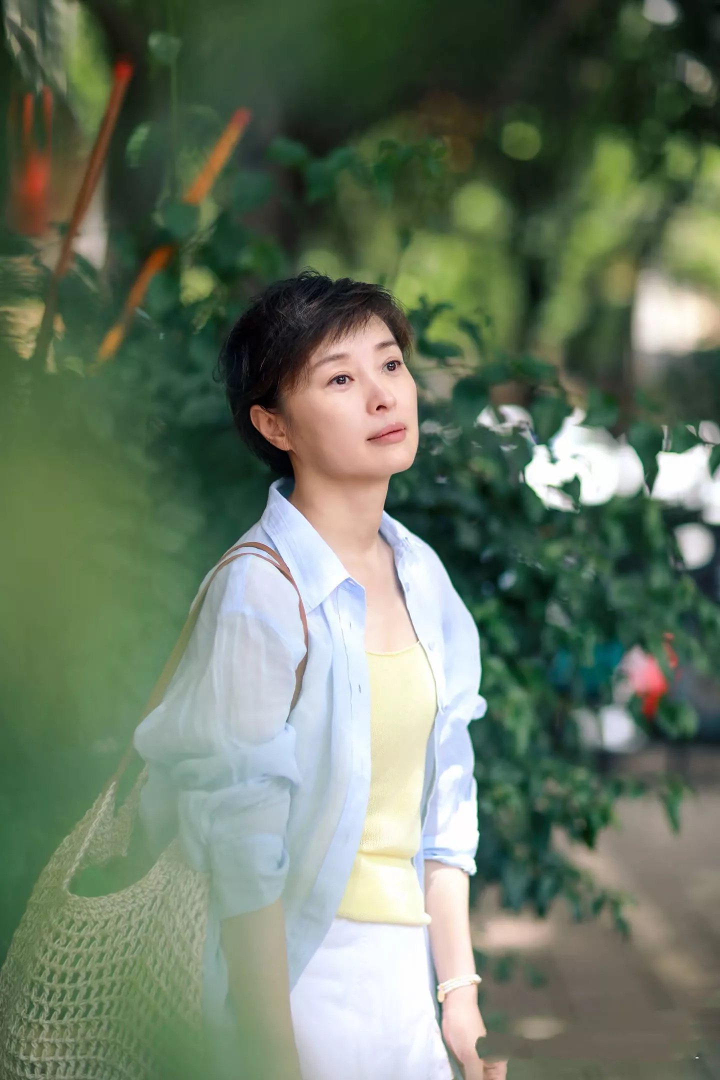 镜头下,吴越穿着一件修身的吊带背心,搭配了宽松且轻薄的衬衫,配上利落的短发、肆意的笑容,多了几分少年感和文艺范。