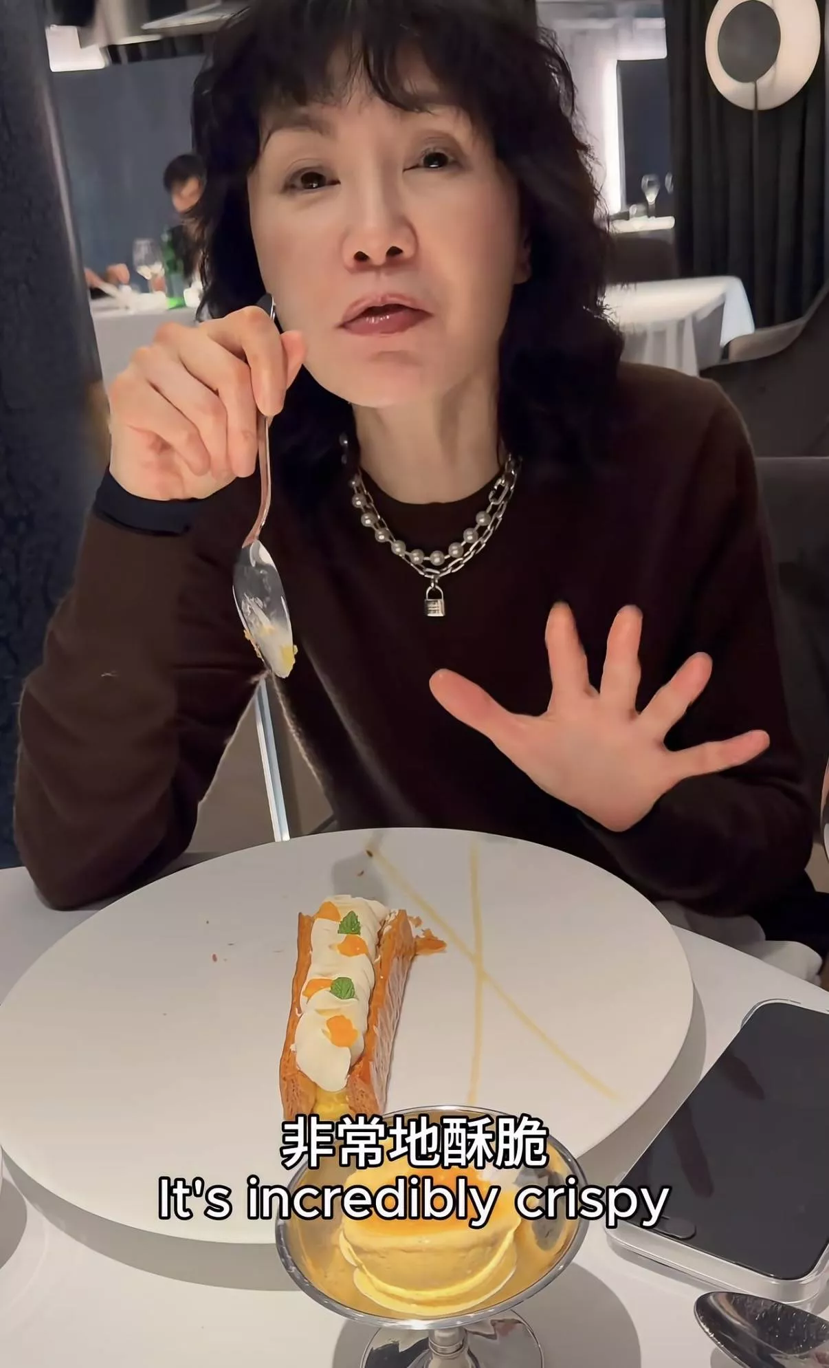 给朋友庆生,他们选择在米其林一星餐厅吃漂亮饭。张曼玉喝了红酒,还点了很多美食,有摆盘好看的蟹肉、还有龙虾、以及烤鸭、牛排、面包、甜品等等。