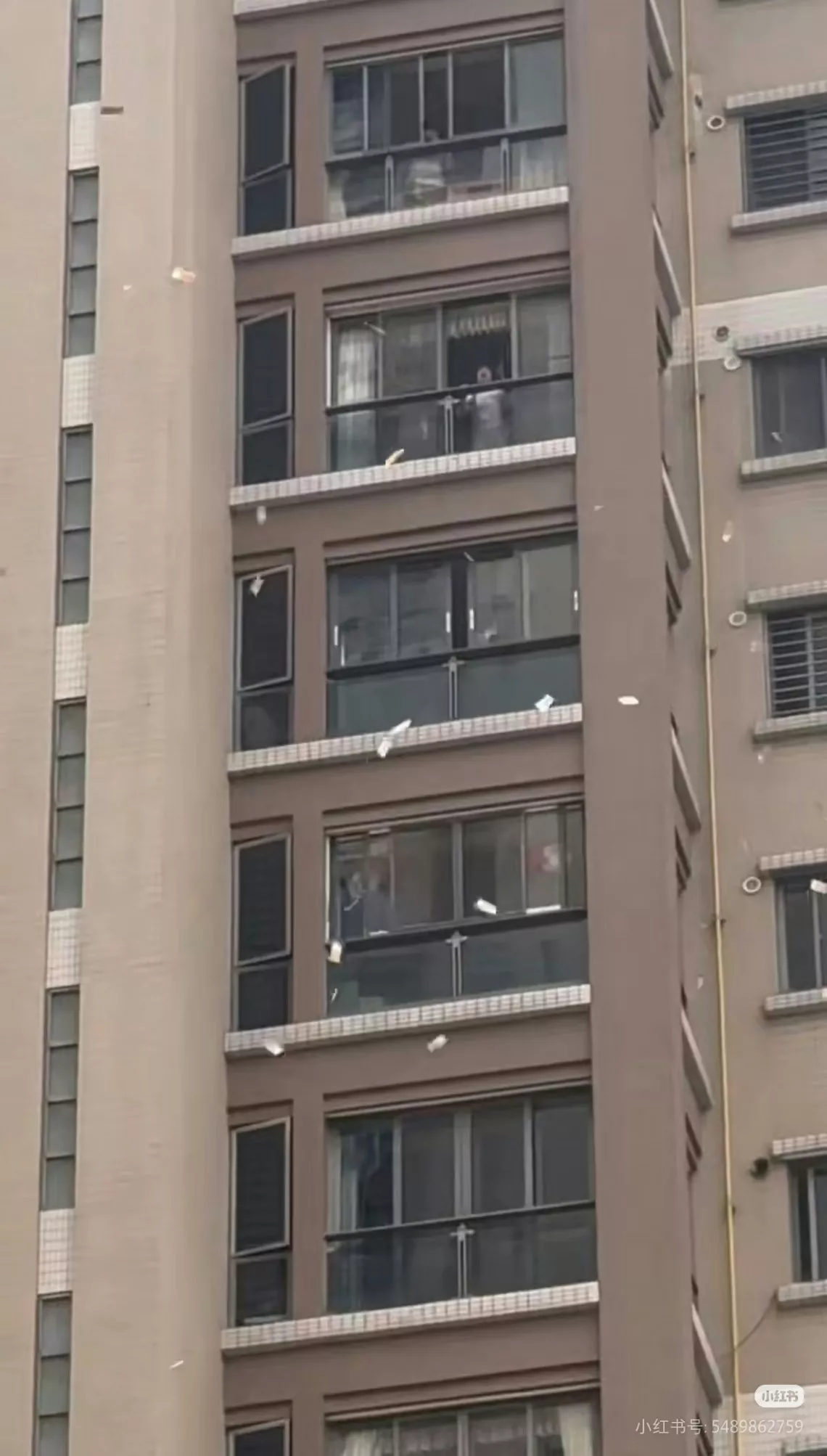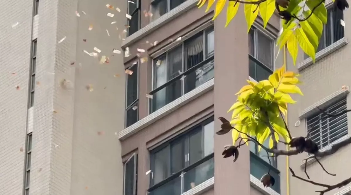从社交平台小红书及Facebook“港车北上分享群”流传的片段可见,一名女子身处高层单位,动作俐落,将一叠叠金黄色的1000元港币撒出窗外。