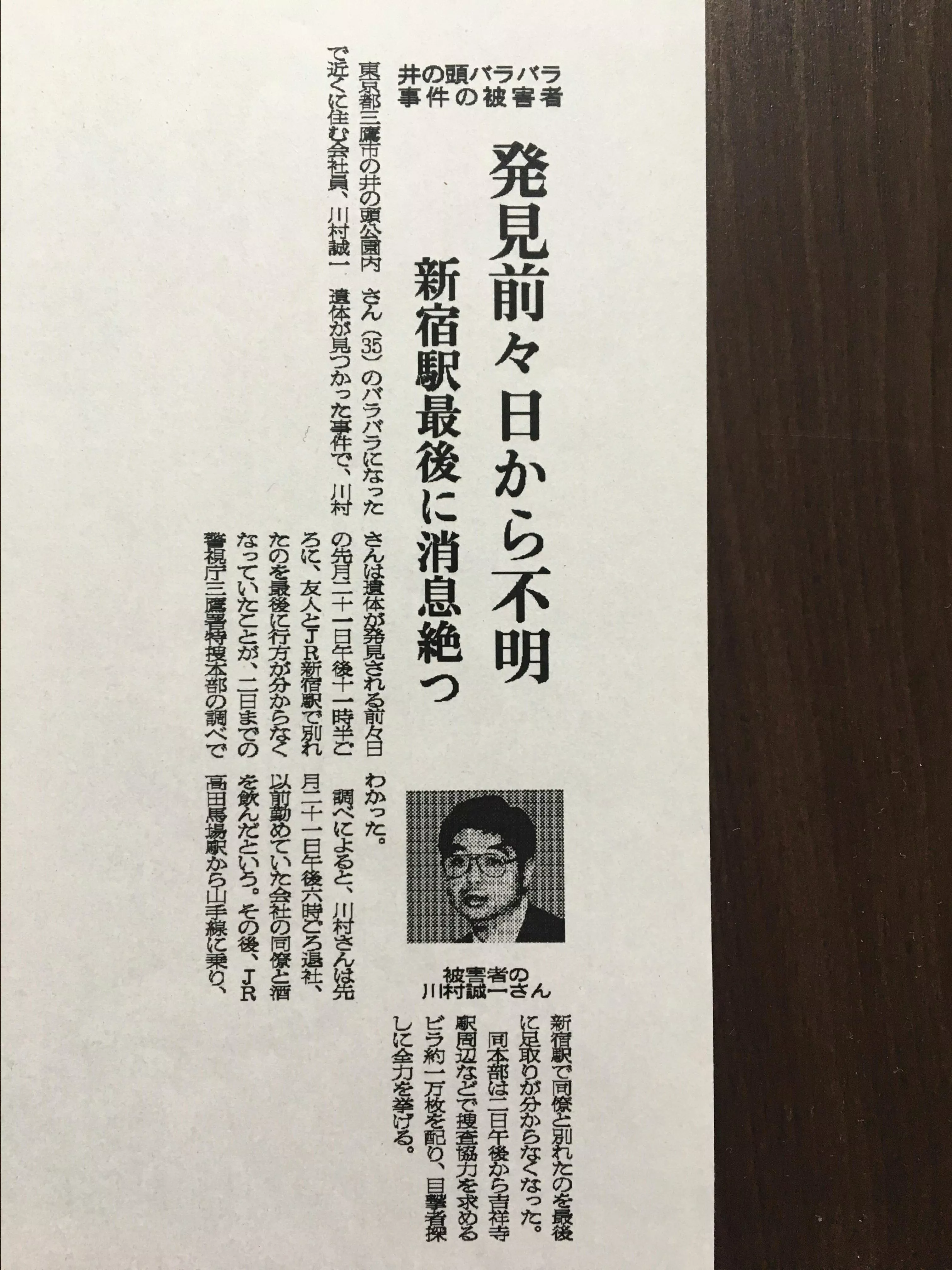 警方随即展开了调查,由于川村在八小时内就身首异处,再加上使用了特殊的塑胶袋捆绑方法,因此推测是专业的团伙犯案,但寻找了是否有大量购入塑胶的人出现,却在这条线索上一无所获。请邻近的居民提供目击情报,有人说,看到川村在一间百货公司前被两名男子殴打,也有人说听到了疑似交通事故的出现,但由于无法特定出任何的可疑人物,搜查陷入了停滞。