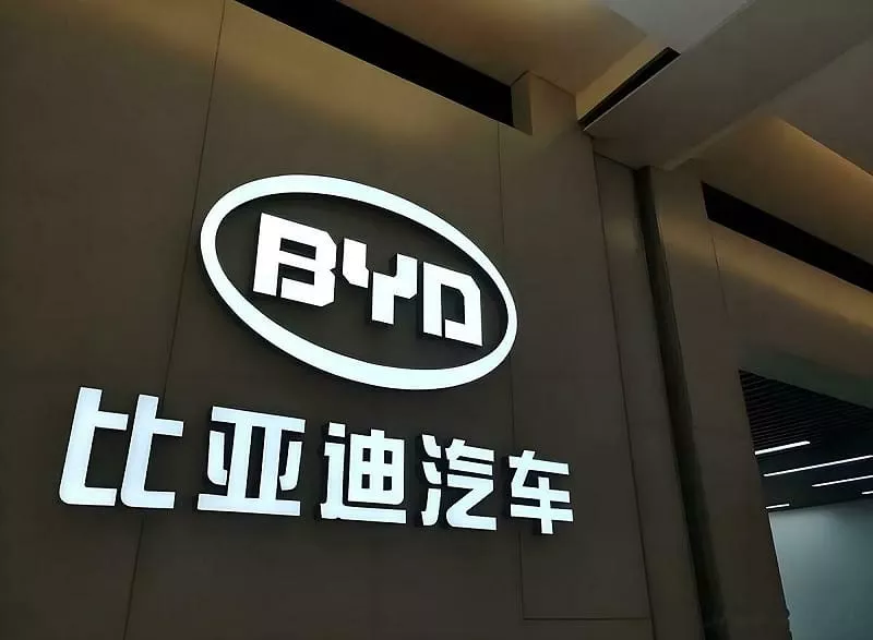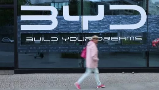 一名妇人走过比亚迪电动车的看板。 图 : IT之家