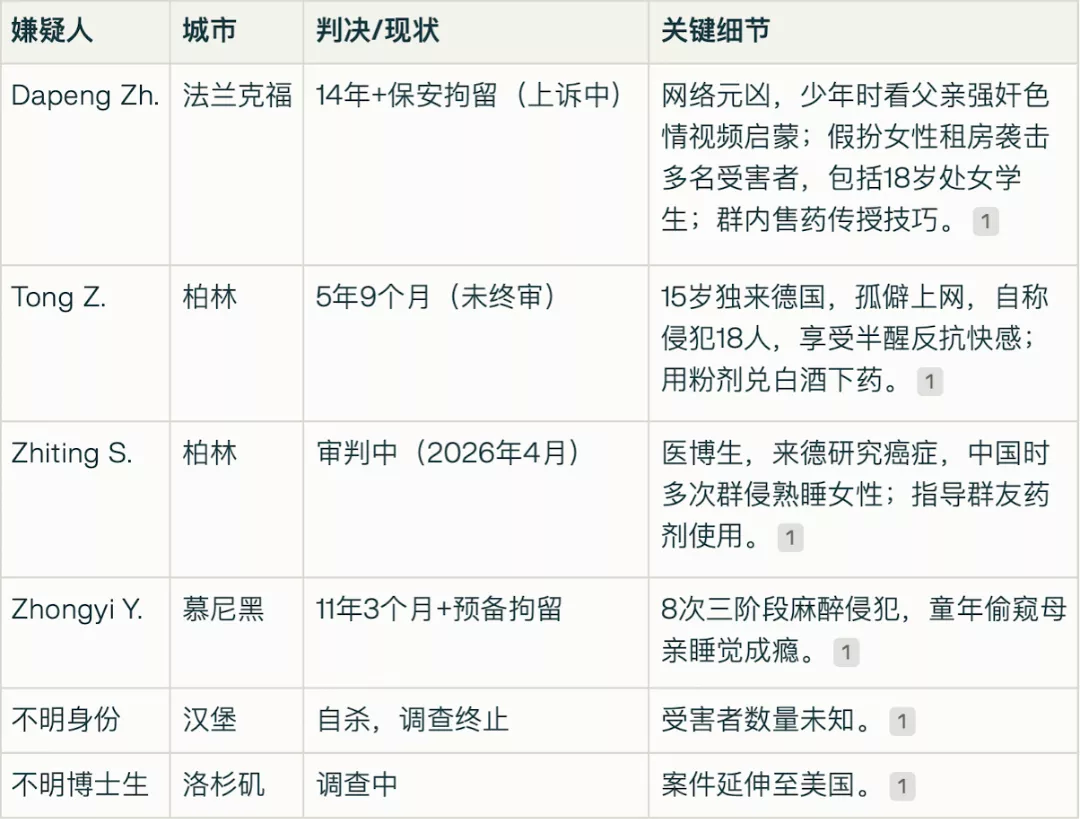 在柏林,还有一位名叫Zhiting S.的32岁医学生,他在2021年来德国研究癌症细胞,同时在群里充当“药剂专家”,传授如何用药物制造完美昏迷效果。他坦承,在中国(北京)时就多次侵犯熟睡女性,有时还拉上同伴一起作案。