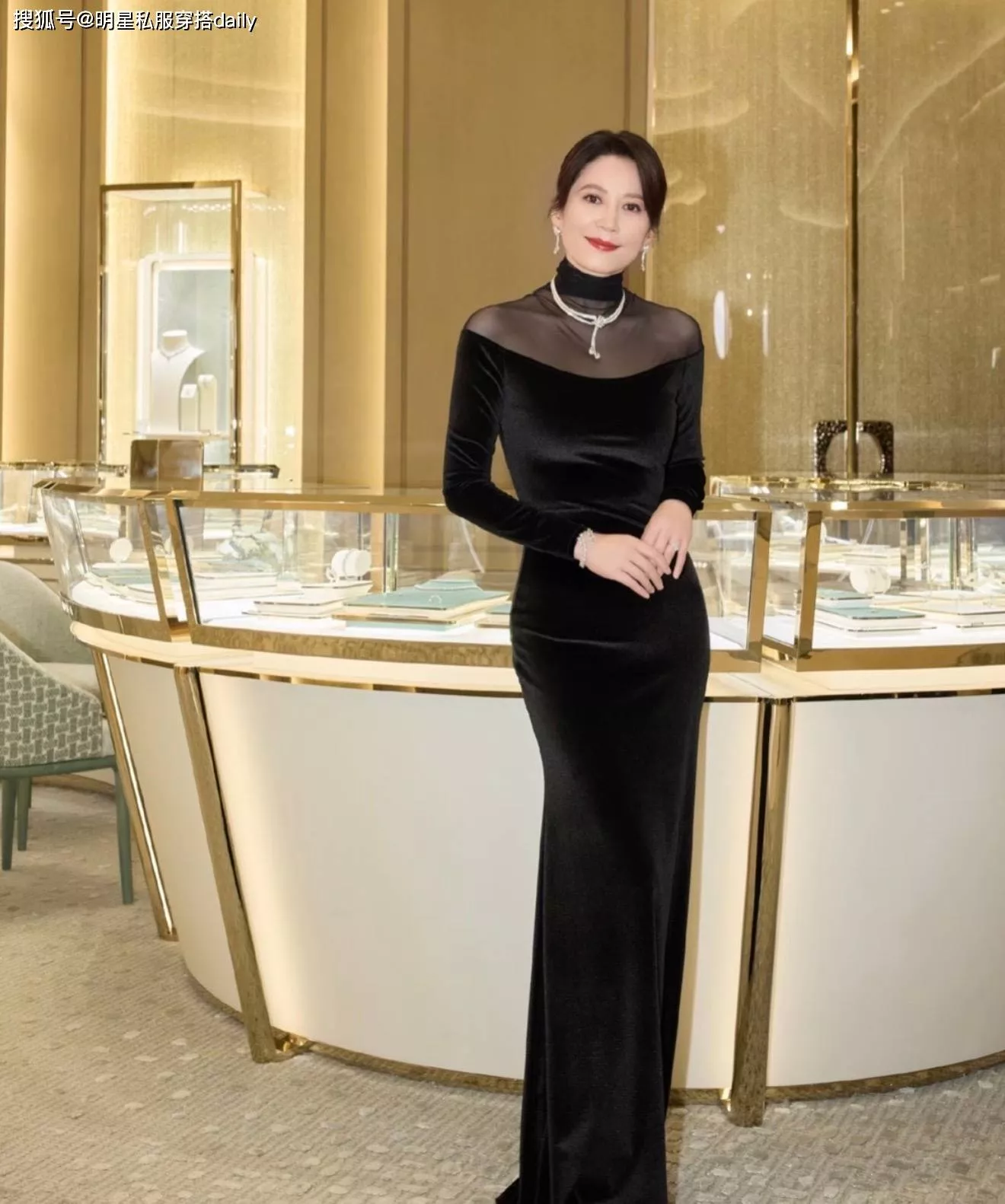 上半身黑色薄纱半高领设计若隐若现展现锁骨曲线!拼接黑色丝面料,层次感拉开!而最绝的就是奢华的珠宝项链!