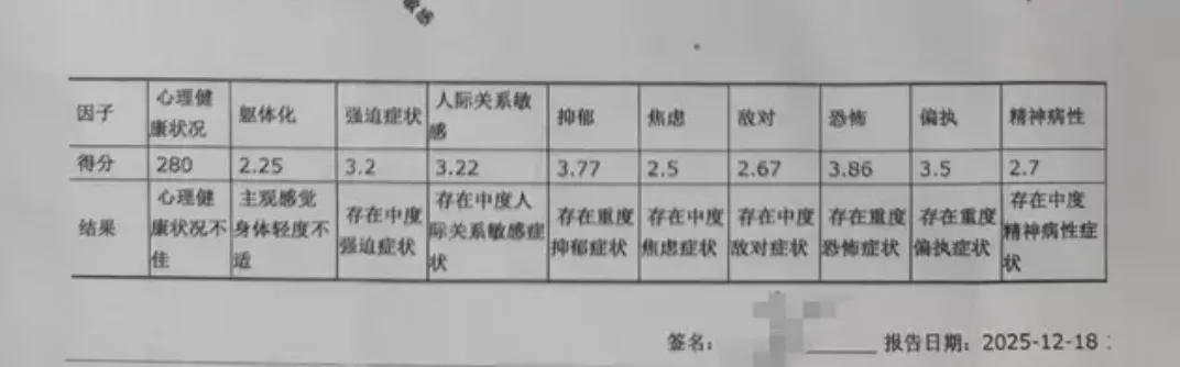 据2025年12月18日医院出具的《心理健康临床症状自评量表》显示,周雨存在重度抑郁症状、中度焦虑症状、中度敌对症状、重度恐怖症状、重度偏执症状、中度精神病性症状等。