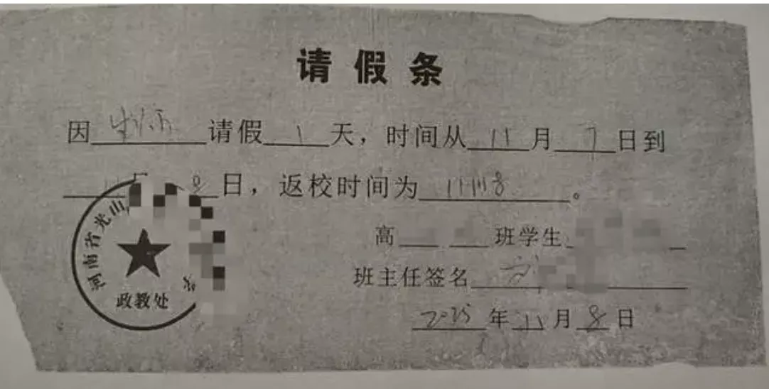 班主任带高一女生去宾馆 写假条称“因生病请假一天”