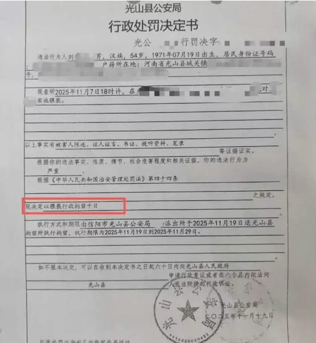 11月19日,光山县公安局出具《行政处罚决定书》,认定刘某对周雨实施了猥亵,其违法行为严重,决定以猥亵对其处以行政拘留10日处罚。