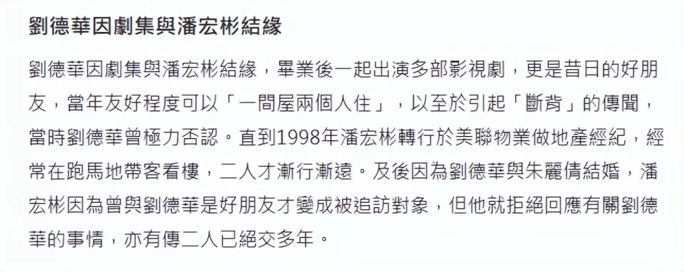 据港媒报道,潘宏彬和刘德华属于患难之交,毕业后为了省钱而一起租房,继而还传出“断背山”,两人从1982年合作《彩云曲》到1994年在《杀手的童话》最后同框,一起拍了6部电影,之后关系疏离,渐行渐远,潘宏彬在1998年离开演艺圈转行卖房,与刘德华不再往来。